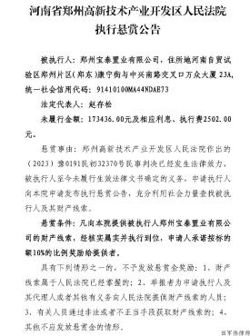 河南省郑州高新技术产业开发区人民法院执行悬赏公告